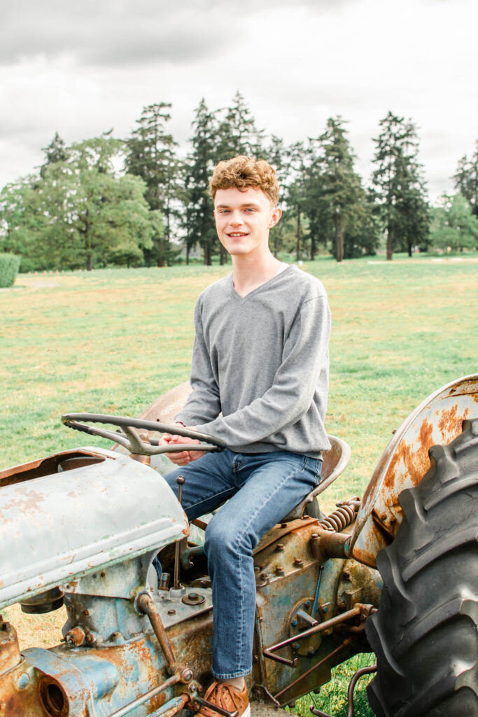 Set against the backdrop of barns, tractors, wide open fields, and weathered fences, this session was pure farm life. The kind of place where every detail has a story — the rust on the old tractor, the way the wooden swing creaks in the breeze, the golden light catching on a strand of tall grass. And right in the middle of it all: Ethan, totally himself, totally at home. Fort Steilacoom Park is absolutely magical for senior sessions!