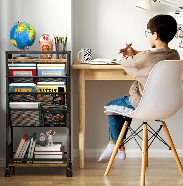 If you want an easy way to keep your homeschool stuff organized and within reach a rolling cart is a lifesaver. These carts roll smoothly so you can move it wherever you need.