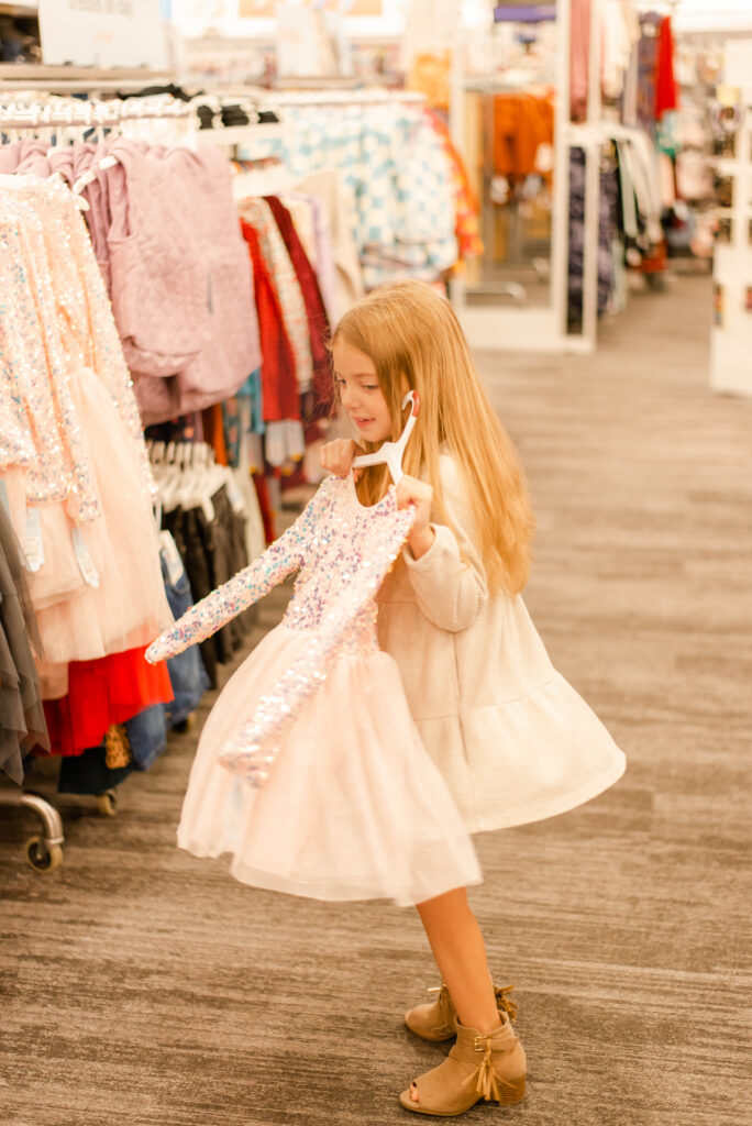 She strolled down the toy aisle, completely lost in the magic of it all. But it didn’t stop there. She wandered over to the clothes section, running her fingers along the soft sweaters and sparkly shirts, and dresses.
